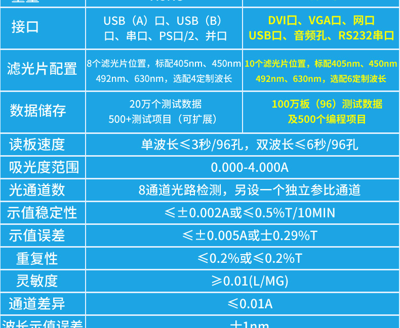 *濾光片配置:10個濾光片位置,標配405nm、450nm、492nm、630nm,選配6定製波長