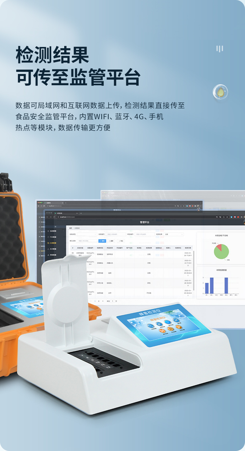 4、儀器帶有監管平台,數據可局域網和互聯網數據上傳,丝瓜视频污污污結果直接傳至食品安全監管平台。進行區域食品安全監管及大數據分析處理與數據統計,丝瓜视频污污污區域食品安全長短期動態,達到食品安全問題預估、預警